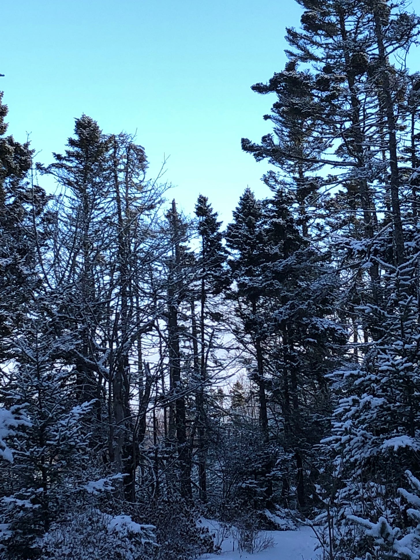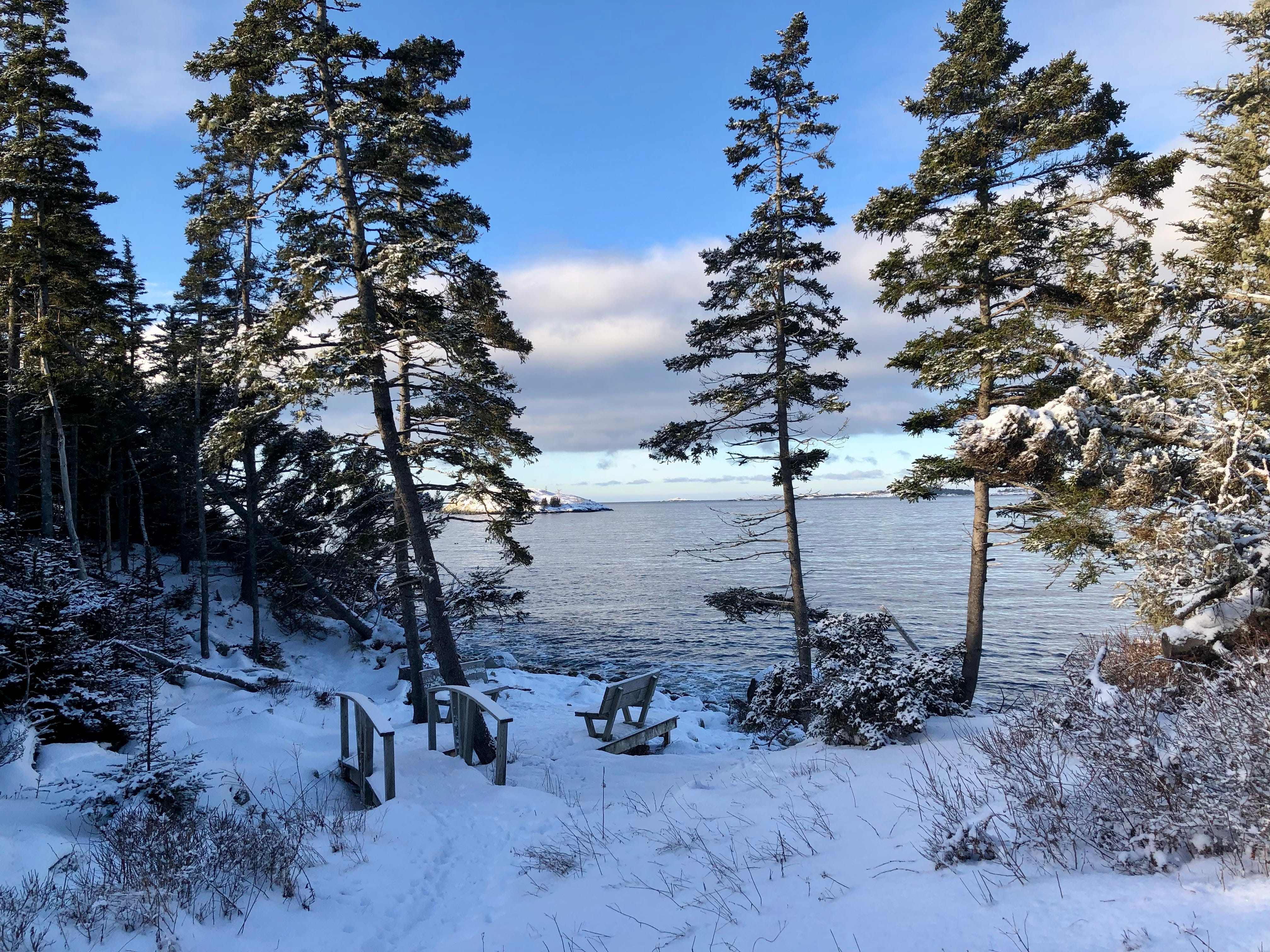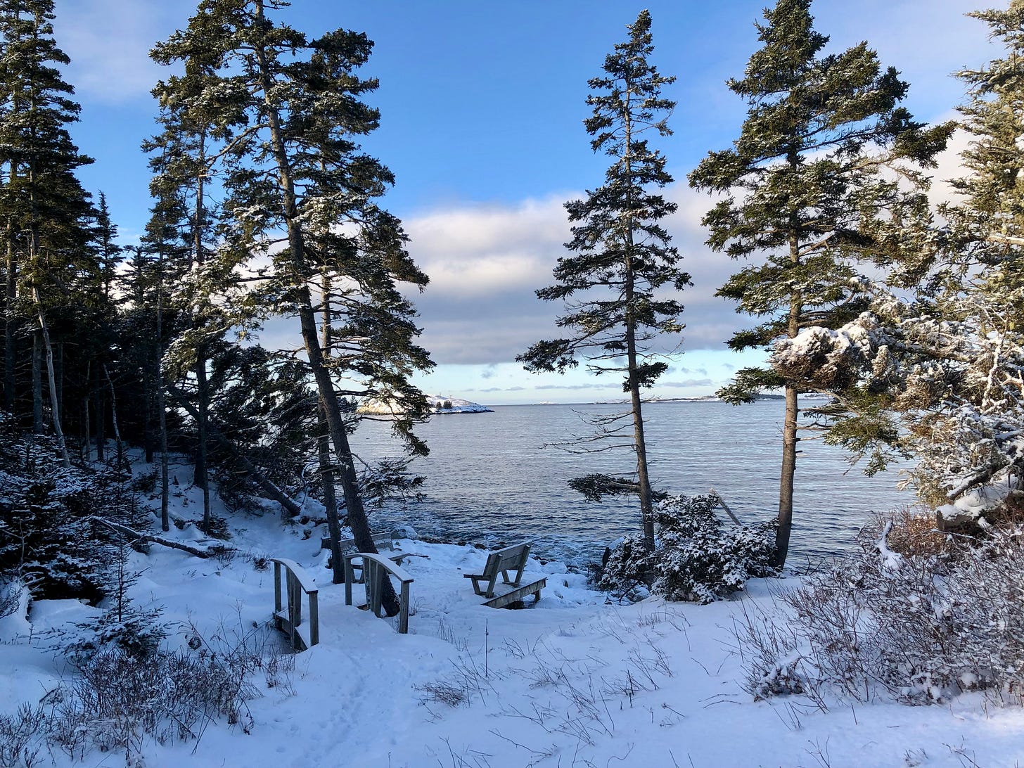 This morning I walked with Sherri through the woods down to the benches where we can sit and look out the bay. I’ve been needing to walk more than our gal wanted to these last months and it was a perfect day to do it – the sun so shiny on the snow, the sea so calm and beautiful, ducks and loons and then blue jays flying overhead and the trees. What my soul needed.