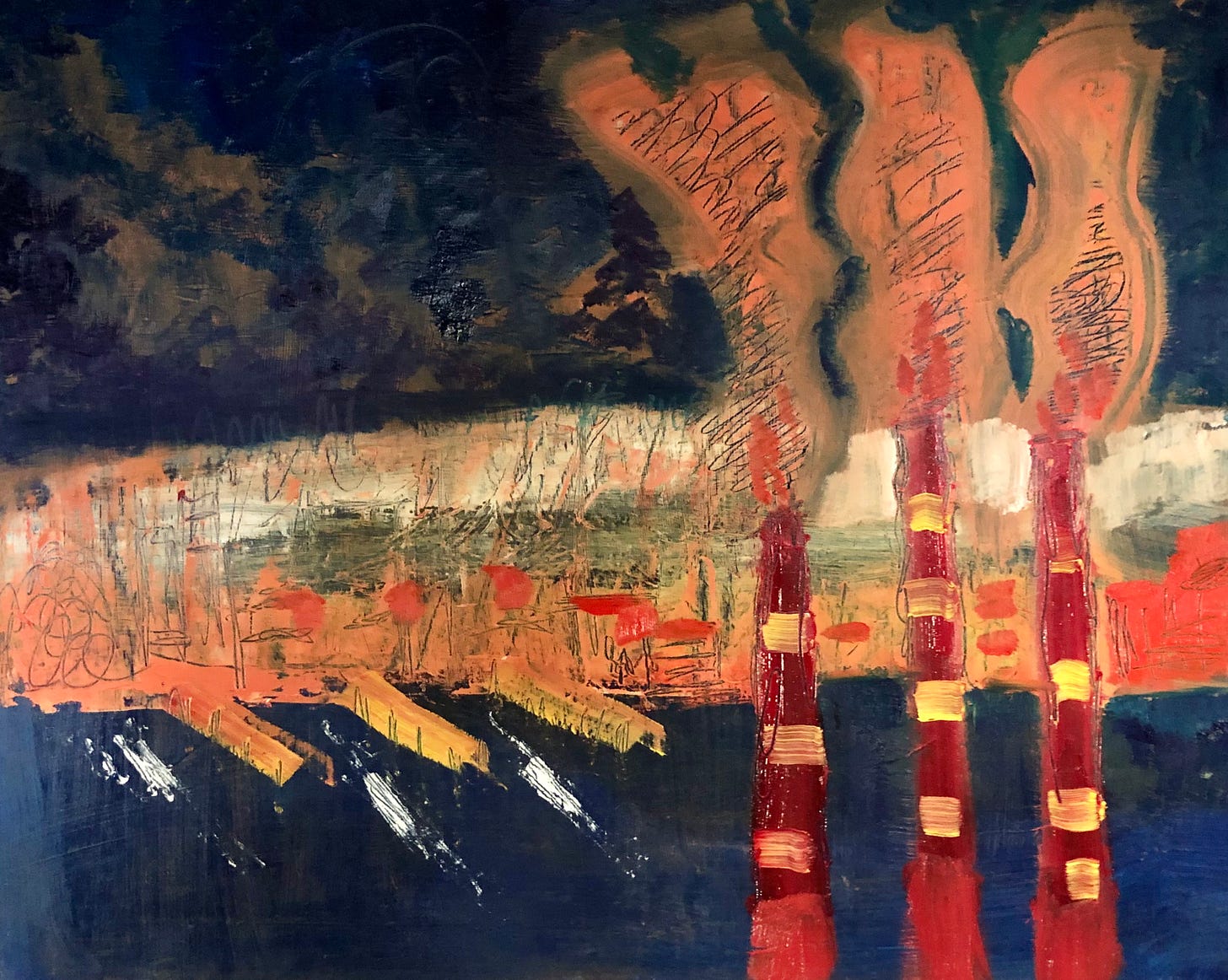 I think I’m finished Harbour with Smoke Stacks or whatever I end up calling it. I am dead pleased with it. It isn’t a pretty painting and I might be the only one but that’s okay with me. And I have three boards ready to paint.