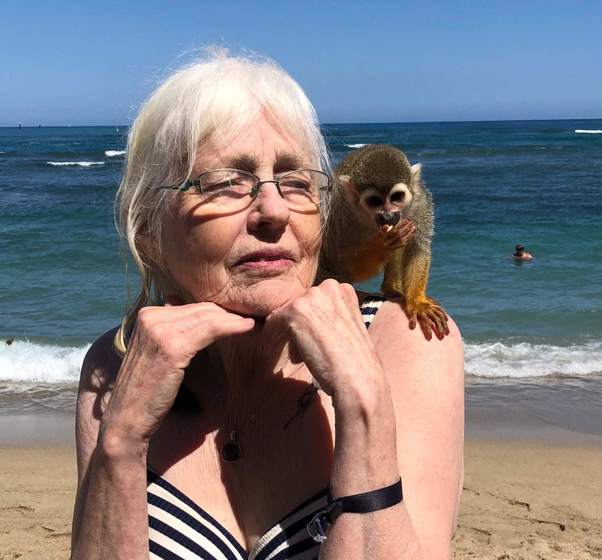 Tina is, I believe, a squirrel monkey. I don’t know her human’s name but I met them on the beach at the resort. Tina’s human walks the beach from one end to the other just around noon. The first time I met them my face lit up – naturally – I mean a monkey! Seeing my expression the man brought Tina to me and she leapt onto my shoulder. I was smitten. He asked if I wanted him to take my picture with her and I said – oh no, I don’t think so. Why? Because I’m used to turning down the bazillion offers one gets on the beach – for massages, to have my hair put in corn rows (ugh), to go on excursions, to buy plastic bracelets from China. So I said it without thinking. But I couldn’t get the thoughts of Tina from my mind – a tiny little being with soft red hair. I knew the relationship would be entirely transactional. She had gone on to my shoulder because her boss had offered her an inducement to do so – a bit of some kind of food – corn nuggets or something. But I was without shame. The next day I didn’t see them as I had gone to get a massage (okay so sometimes I say yes). The following day we were being seduced by these salespeople from the resort next door, being fed a great lunch and plied with liquor (hmm...I guess I’m a complete sap come to think of it) and so as it turned out, it wasn’t until our last full day that I saw them again. I asked the human how much to have the photographs and handed over the dough without a thought. If he’d said a hundred bucks I probably would’ve paid it. It wasn’t for the photos though. It was to just have time with the tiny little creature. He made me put my hands flat and she sat on my hands for a bit, then on to my shoulder for some more photos and then up on to my head which was weird and nothing I wanted, then back to my shoulder where the human entreated me with gestures to put my hands under my chin which I thought weird. It reminded me of when the boys were little and we had photos done (imagine!) and the photographer would prop their large heads on their tiny hands for that oh so natural look. I told the fella later that I thought it was because he knew women my age didn’t look so hot in the neck department. Who knows. And then it was over. Me and Tina were done and I was left with forty photos all mostly identical with extremely dumb hair from being wet and then under a ball cap. But Tina is beeeyoutiful.